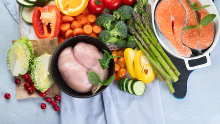 Paleo diet food on light gray background. Healthy high protein and low carbohydrate products. Top view, flat lay