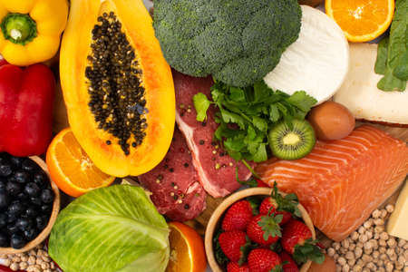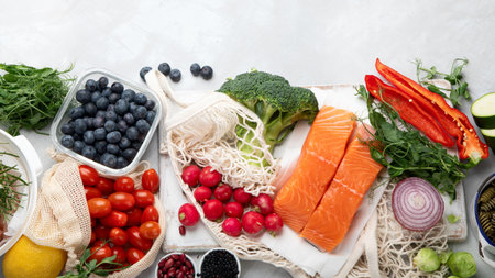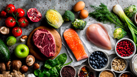 Vibrant fresh food, vegetables, fruits, legumes, fish, and meat