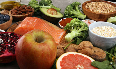 Healthy food clean eating selection: fish, fruit, vegetable, cereal, leaf vegetable on background