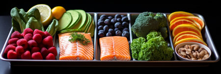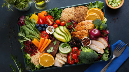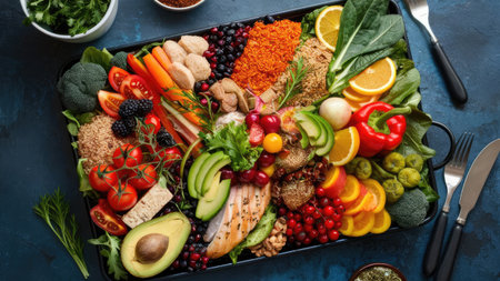 A visually appealing tray displays a variety of colorful fruits, vegetables, and protein sources, showcasing a healthy and balanced meal.