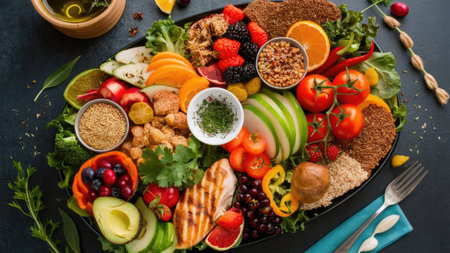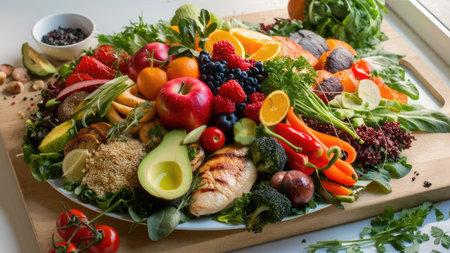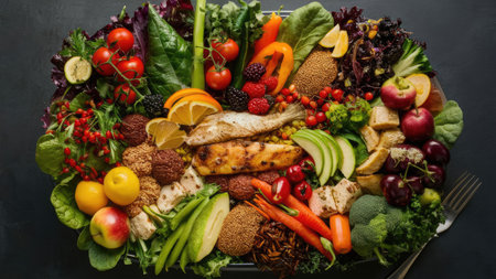A visually appealing platter showcases a variety of colorful fruits, vegetables, grilled chicken, and grains, representing a healthy and balanced meal.