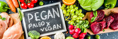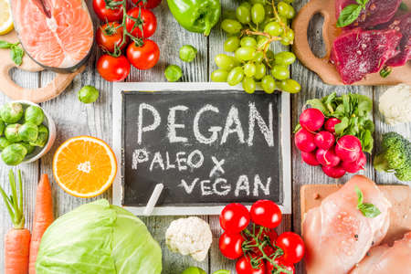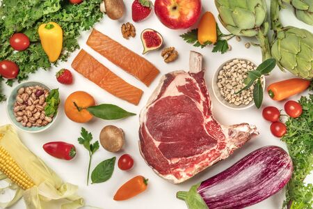 Trendy pegan diet - vegan plus paleo diet food concept, many fresh vegetables, fruits, raw beef and chicken meat, salmon fish, white wooden background top view copy space