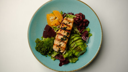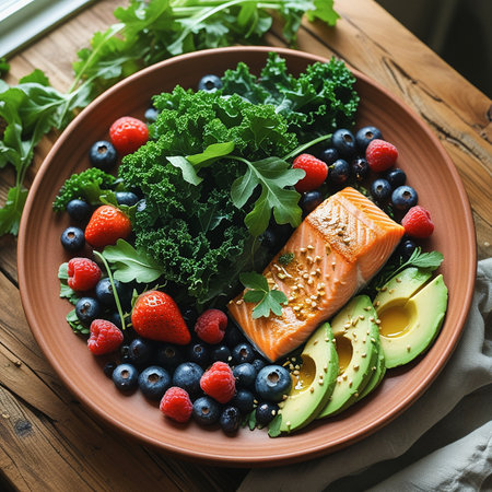 Fresh salmon slices paired with avocado, mixed greens, berries, and nuts, creating a colorful and healthy gourmet salad dish.