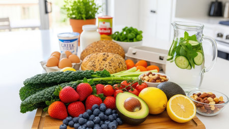 A wooden board displays an array of fresh food items including fruits, vegetables, bread and dairy products. The composition is brightly lit with natural light, suggesting a healthy lifestyle. This image could be used in advertising material or editorial content related to nutrition, cooking or wellness.