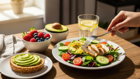 An overhead shot showcases a diverse array of healthy food items. It features a colorful salad, fresh berries, avocado, and a refreshing drink on a wooden table. The scene is illuminated by natural light, casting soft shadows. This image could be utilized for various commercial purposes, including health, wellness, and lifestyle content.