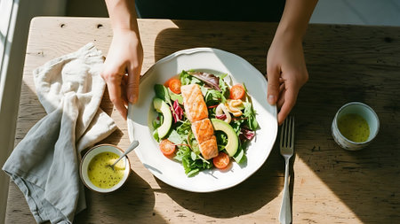 cropped shot of woman eating salad with salmon at table in cafe