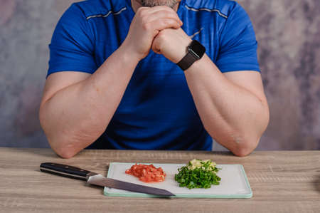 A man cuts green onions on a board. Healthy eating
