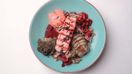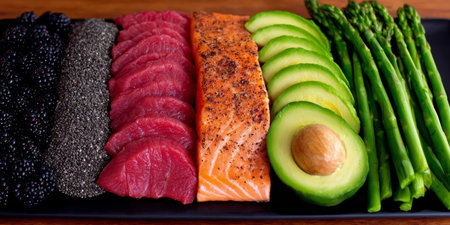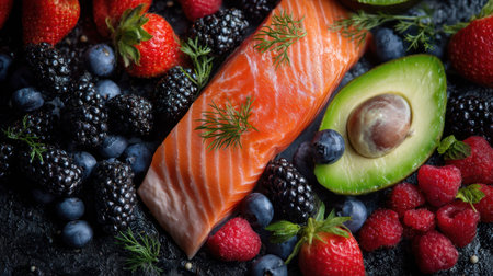 A vibrant and fresh salmon fillet artfully placed among an array of colorful berries and a sliced avocado, creating a stunning culinary display.
