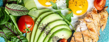 Fried egg. Close up view of the Chicken grilled fillet, fresh tomatoes, cucumbers, and avocado. Ketogenic diet breakfast. Food recipe background.