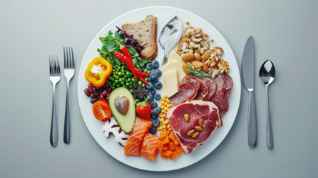 a plate divided into sections, a balanced diet that emphasizes the importance of the right types of fats, countering the notion that saturated fats are the primary culprits of cardiovascular disease