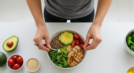 Woman preparing a healthy buddha bowl with chicken, avocado, and vegetables. Clean eating, balanced diet for wellness and fitness.