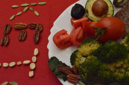 Paleo meal plan for a week on a table among tomatoes, fish, nuts, greens and avocado. healthy eating, dieting, slimming and weigh loss concept, top view. less carohydrates concept.