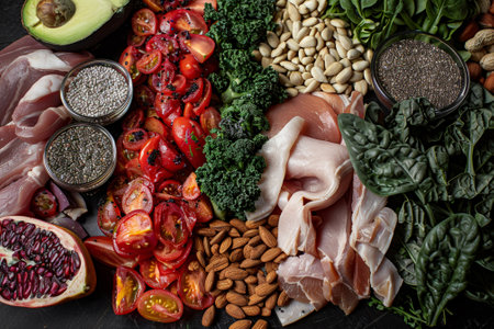 This striking image features a vibrant arrangement of various meats, fish, and vegetables against a dark background, ideal for promoting healthy eating and nutrition.