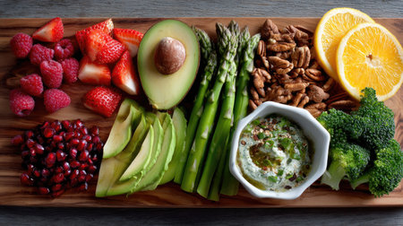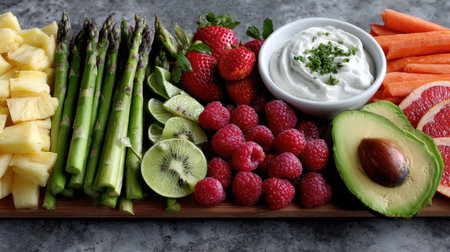 A visually appealing arrangement of assorted fresh fruits and vegetables, including asparagus, strawberries, and avocado, served with a creamy dip.