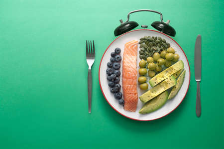 Keto nutrition including carbs, protein and fat on a plate with clock alarm
