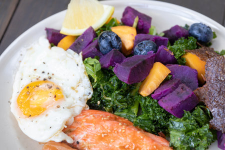 Healthy salad with fried egg, salmon, kale, sweet potato and blueberries on white plate.