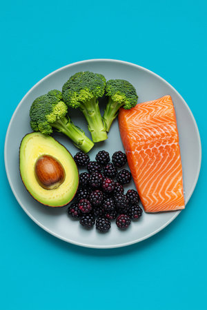 Assortment of kidney-friendly foods including salmon, avocado, broccoli, and berries arranged on a plate with colorful backgrounds, symbolizing healthy nutrition for kidney health and wellness.