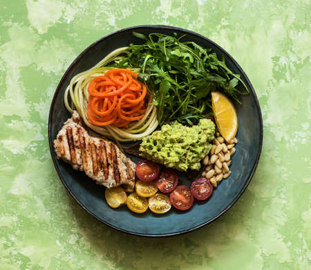 Balanced food concept. Buddha bowl salad with grilled chicken breast, arugula, avocado, carrots and zucchini, balanced clean eating, top view. Healhty lunch bowl.