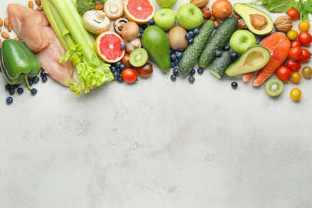 Selection of healthy food on light gray background. Clean eating concept. Top view, flat lay, copy space