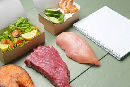 Notebook with healthy products on table