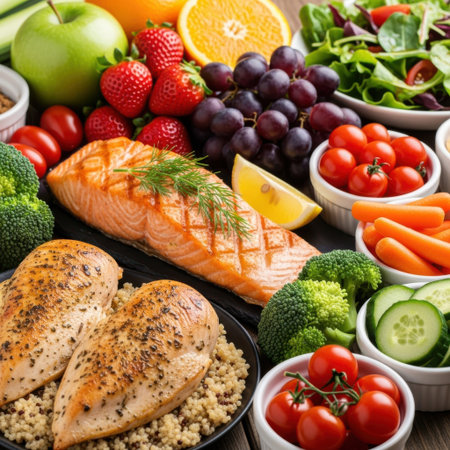 This image showcases a vibrant and nutritious meal featuring a variety of proteins and fresh fruits. The plate includes grilled salmon and chicken breasts, accompanied by quinoa. Surrounding the main dishes are an array of fresh fruits and vegetables, including strawberries, grapes, tomatoes, broccoli, cucumbers, carrots, and an apple. The meal is garnished with a lemon wedge and fresh dill, making it both visually appealing and wholesome.