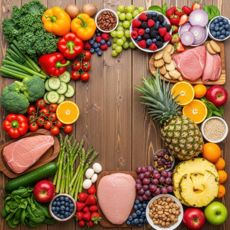A vibrant and colorful arrangement of various fruits, vegetables, and meats forming a square frame. The image showcases a diverse range of fresh produce including broccoli, bell peppers, tomatoes, grapes, blueberries, strawberries, pineapples, oranges, and more. Additionally, there are cuts of meat such as steak and chicken, emphasizing a balanced diet.
