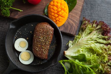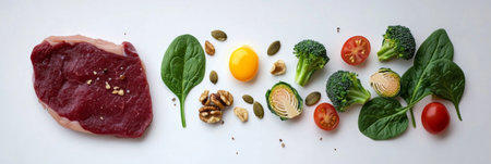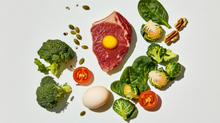 Raw steak surrounded by eggs, tomatoes, spinach, broccoli, Brussels sprouts, nuts, AI generated