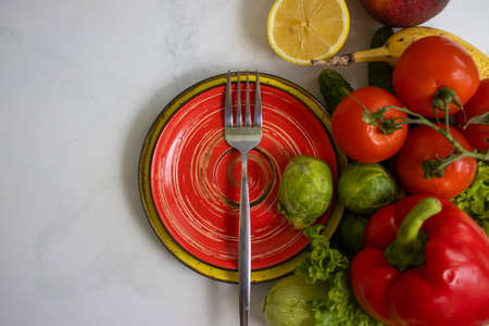 Plate of different vegetables and fruits on a light background