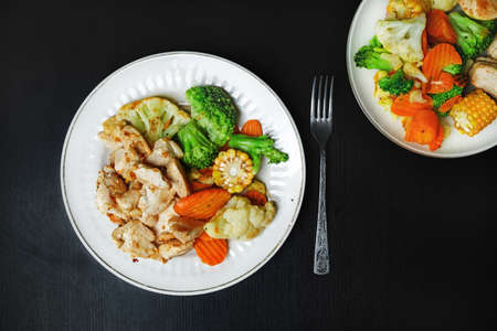 Grilled chicken breast fillet with roasted vegetables. concept healthy food. flat lay.