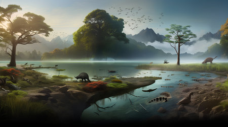 Fantasy landscape with animals. 3D render of wild animals in the lake.