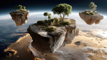 A stunning illustration of floating islands adorned with lush green vegetation, suspended above a celestial landscape, creating a serene and dreamlike atmosphere.