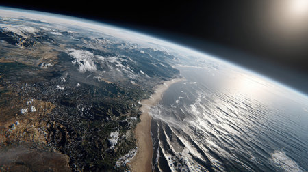 This breathtaking image captures a unique perspective of Earth from space, showcasing the stunning coastal landscape, ocean waves, and majestic mountains.