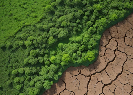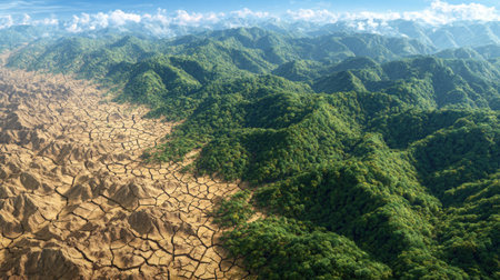 This stunning aerial shot showcases a dramatic juxtaposition of vibrant green mountains and parched, cracked earth, highlighting climate change effects.