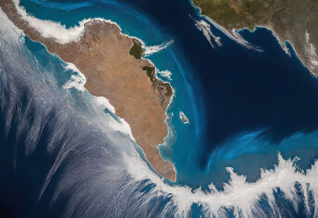 This stunning aerial view captures the vibrant contrast between land and water, showcasing Earth's beauty from a unique perspective while highlighting remarkable atmospheric dynamics.