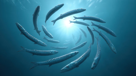 A mesmerizing scene of fish swimming in a dynamic school, illuminated by sunrays filtering through the vibrant blue waters of the ocean.
