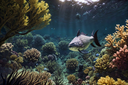 A visualization of realtime data analytics overlaid on a serene underwater landscape indicating coral health indices and marine life diversity derived from images captured by underwate