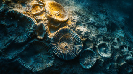 An intricate display of fossilized shells and corals showcasing rich textures and vibrant colors. Perfect for nature lovers and geology enthusiasts.