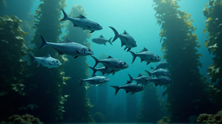 School of sleek fish swim through vibrant kelp forest in clear ocean depths