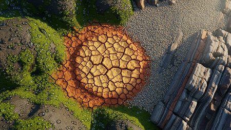Earth showing down view of cracked dry earth surrounded by mossy rocks with water droplets and small pebbles...