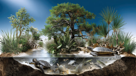 This detailed illustration showcases various ecosystems, highlighting biodiversity with vibrant colors, intricate patterns, and interconnected life forms in a captivating design.