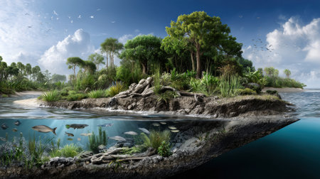 A beautiful island with a body of water in the background. The island is surrounded by trees and has a variety of fish swimming in the water