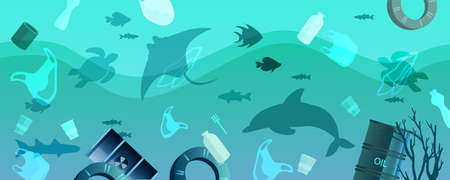 Water pollution environmental concept with plastic bags, bottles,barrels, litter in the muddy water. Ocean animals and fish silhouettes. Zero waste banner in trendy blue colors for ecological projects
