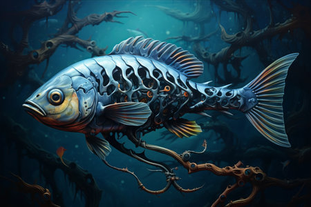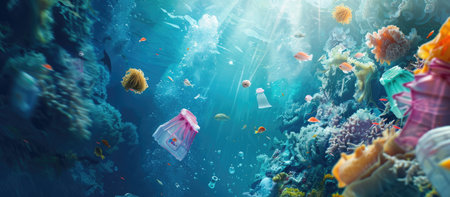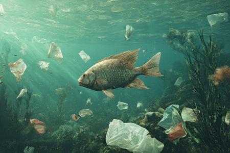 Fish swimming in an ocean filled with bags plastic and other garbage, highlighting the problem of pollution