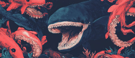 Sea creature attacks diver, fantasy underwater monster scene, generative AI illustration