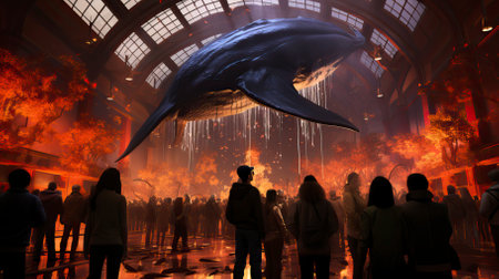 In a museum of the future, history is brought to life not with dusty fossils, but with radiant, glowing holograms. Luminous blue skeletons of prehistoric creatures stand as testaments to evolution, blending ancient biology with cutting-edge technology.