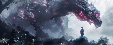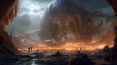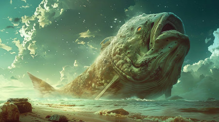 Venture into an enchanting world of fantasy with this stunning AI generated image of a colossal sea creature emerging from the ocean. Perfect piece for your collection. Generated A.I.