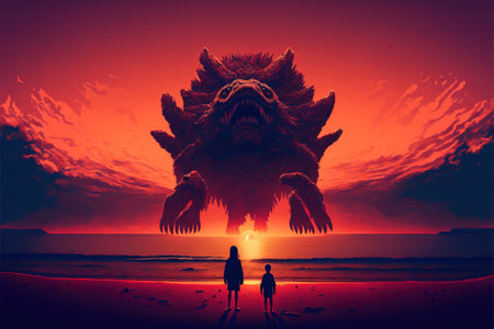 Two children fighting with the giant alien. boy and girl looking at giant alien monster at the horizon. Digital art style, illustration painting.
