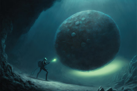 Diver discovers a huge glowing sphere under the sea, digital art style, illustration painting, fantasy concept of a diver in the sea