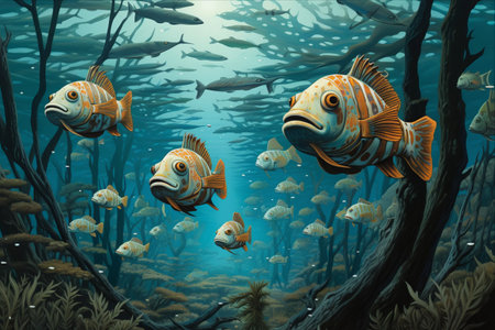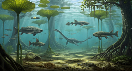 Illustration of prehistoric underwater animals, giant fish, earth history