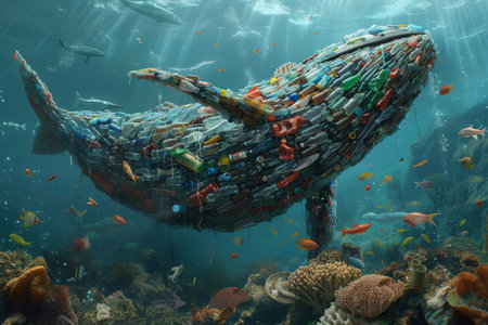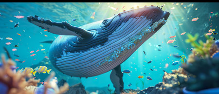 Whale, Plastic pollution, Saving marine life through education, Underwater scene, Sunny day, 3D render, backlighting, Vignette, Extreme close-up shot